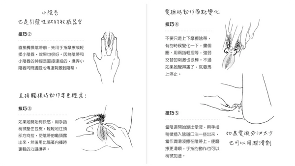 對於女性而言陰道內有快感的部位有兩個地方,那就是G點和子宮頸口,G點在進入陰道口約四∼五公分靠近腹部的地方,由於它只是小小的、直徑約一公分的範圍,只要一隻中指就可確實地愛撫,但是手指不像陰莖,在陰道進進出出的根本就沒有意義。一旦抓定G點的位置,就用指腹以按壓的方式刺激才對。也可以像搔癢似地畫小圓圈摩擦。 在手指刺激G點的同時,可以再透過舌頭去刺激陰蒂(陰蒂是外陰部最敏感的地方),用舌尖上下挑動陰蒂,或是順時針/逆時針圈舔刺激陰蒂周圍的神經,都可以增加對陰部的刺激。 圖片來源:究竟出版社
